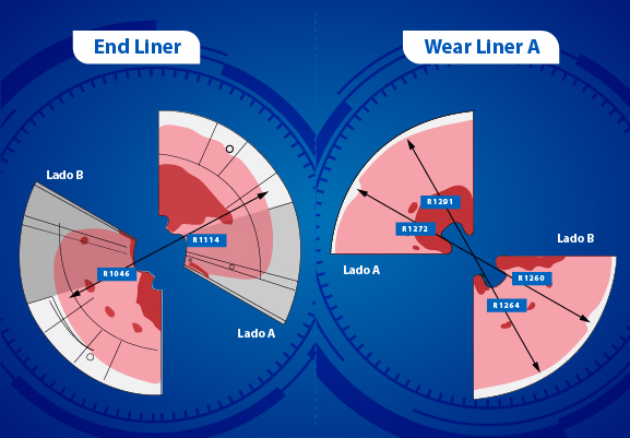 • The Heavy Duty end liner on Side A successfully safeguards 100% of the mill’s curvature, as it still had 114 mm remaining before reaching the recommended critical radius for replacement.