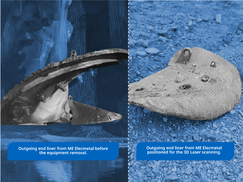 After the campaign, the pieces were arranged for the ME Elecmetal team to conduct scans of the outgoing liners utilizing a 3D laser scanner. The subsequent images illustrate the removal of the pieces and their measurement: